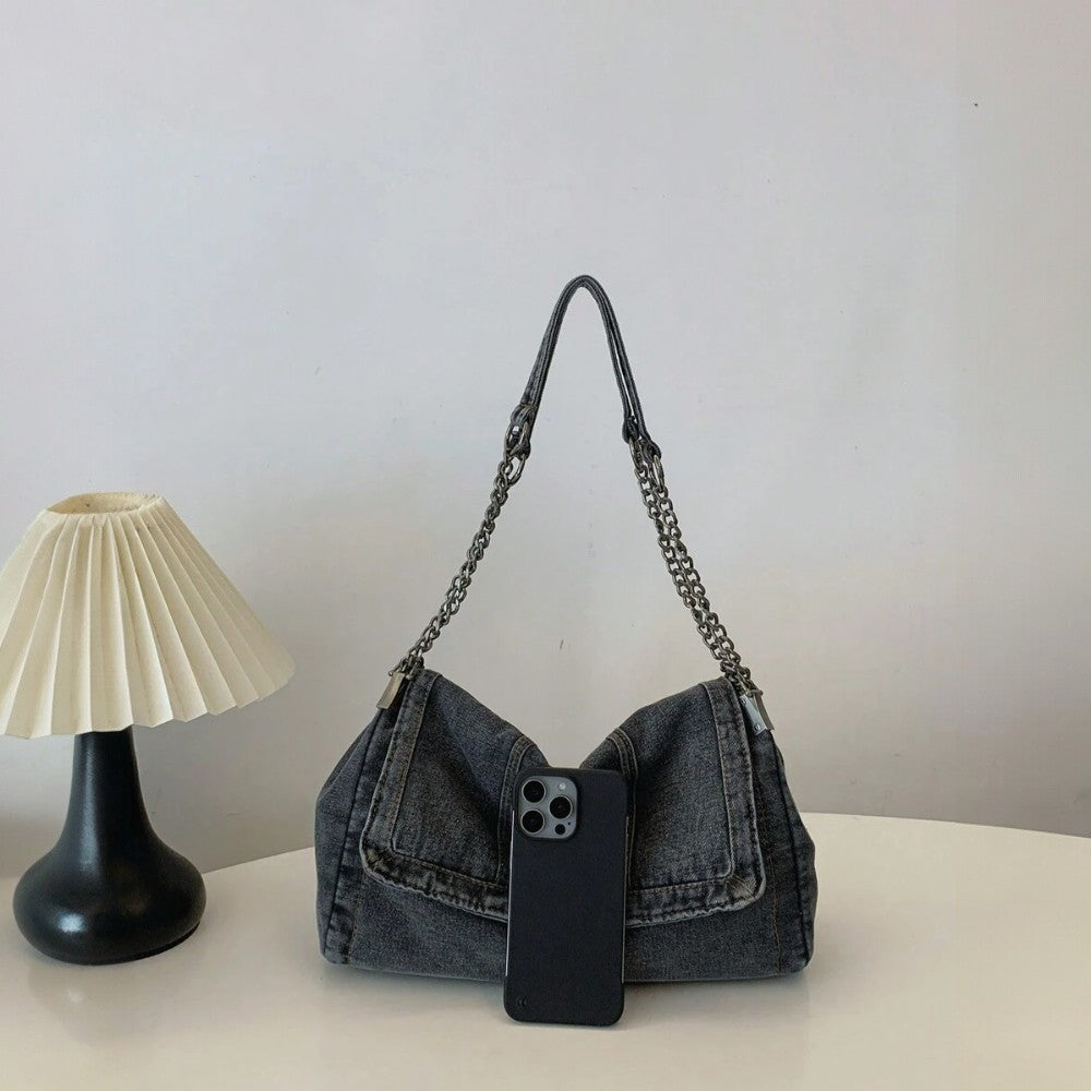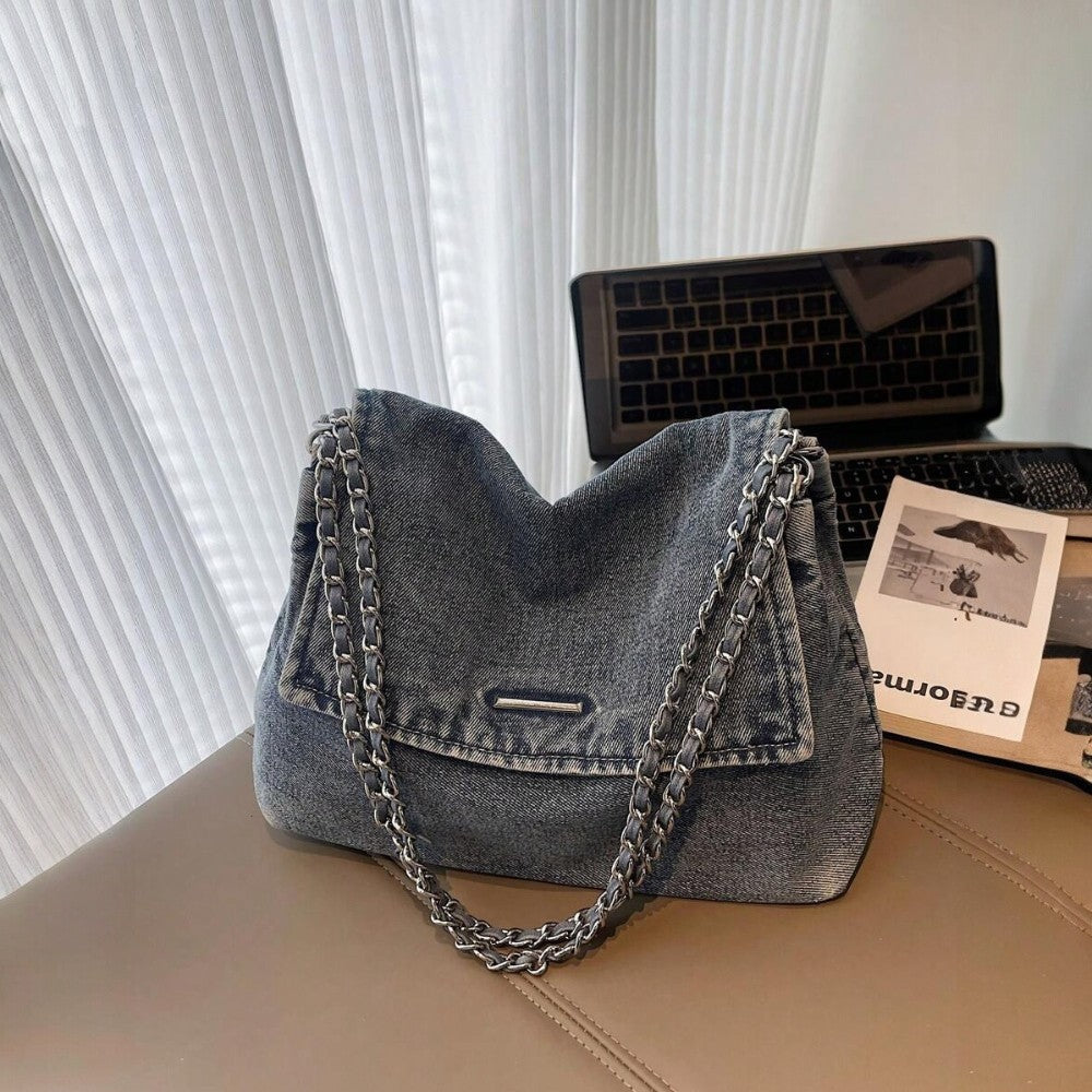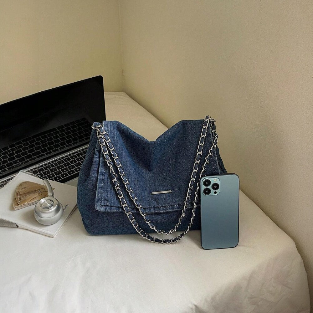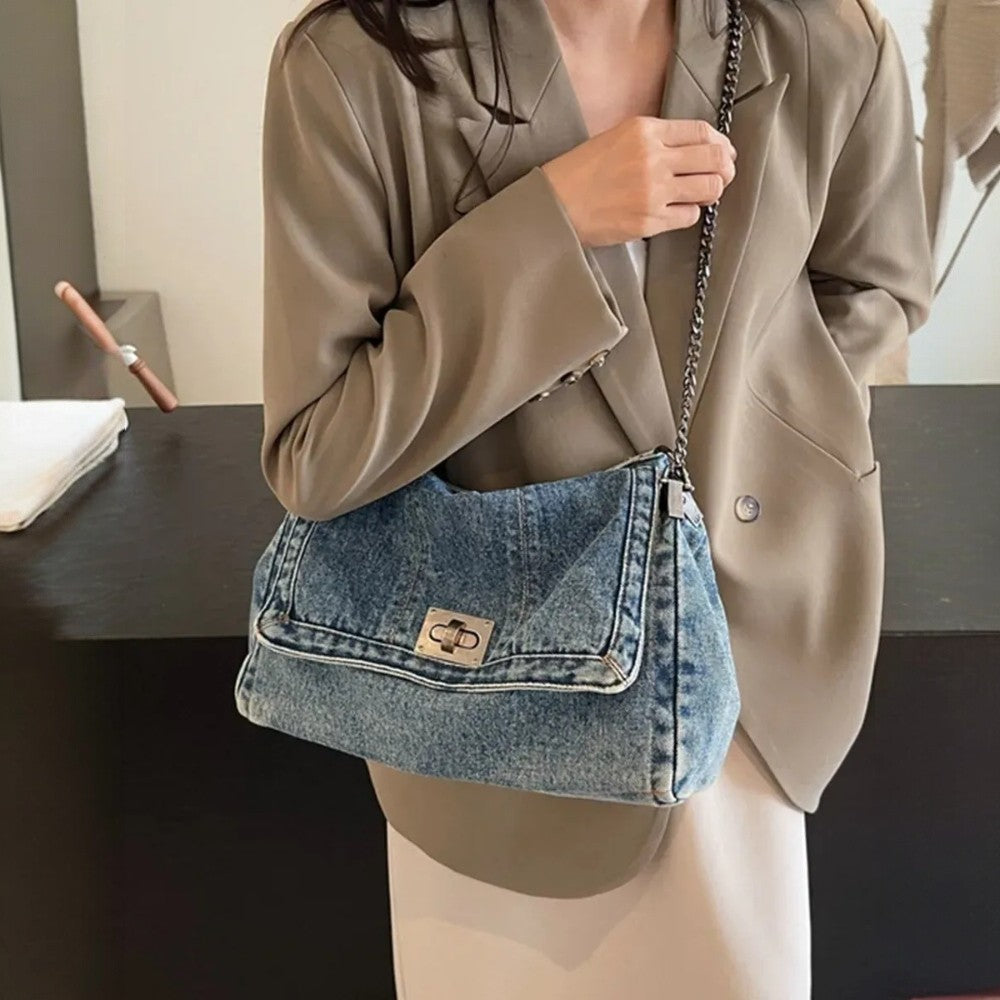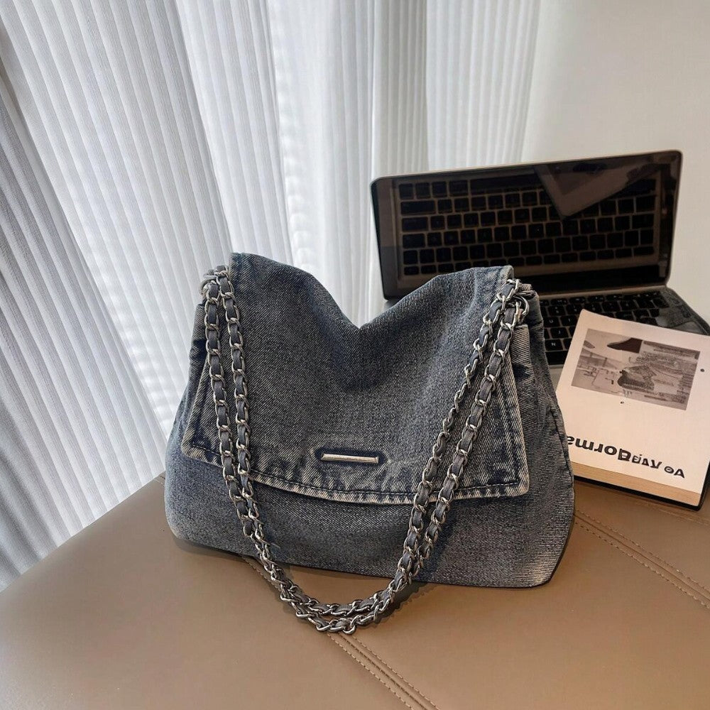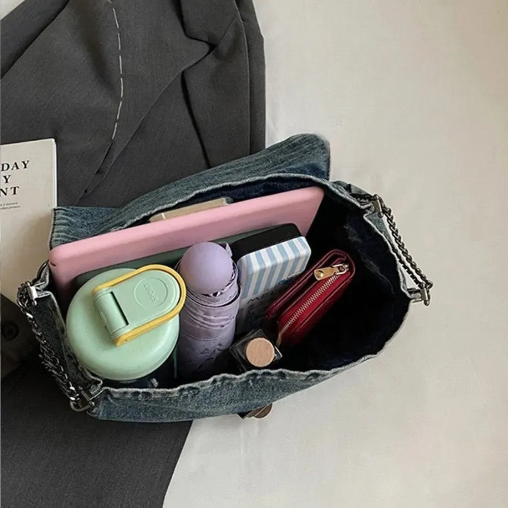 Η τσάντα Grace μας είναι κατασκευασμένη από υψηλής ποιότητας τζιν, συνδυάζοντας casual στυλ με ανθεκτικότητα. Σχεδιασμένη να είναι αρκετά ευρύχωρη, χωράει εύκολα τα απαραίτητα σας: φορητό υπολογιστή, μακιγιάζ και καθημερινά αξεσουάρ.